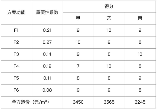 某工程有甲乙丙三种方案可选择,经分析后得到个方案重要性系数得分及工程成本如上表所示: