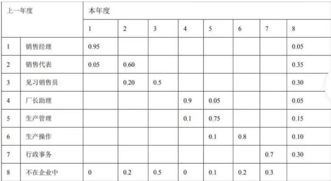 不定项选择题 近年来,F 公司每年都会进行人力资源规划工作,积累了丰富的公司人员和职位数据。公司发现,进行人力资源供给预测时,利用转移矩阵的方法比较有效。