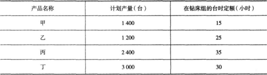不定项选择题 某机械加工企业生产甲、乙、丙、丁四种产品,各产品在钻床组的台时定额及计划产量如下表所示。钻床组共有铣床15台,每台铣床的有效工作时间为3600小时。