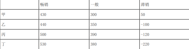不定项选择题 某汽车生产企业通过联合生产形式与外国某世界500强汽车公司建立战略联盟,获得良好的市场效果,为降低企业生产成本,该企业进军汽车配件行业,自主生产和供应汽车配件,同时,为扩大企业利润,该企业建立手机事业部,推出自主品牌的新型手机,通过预测,手机市场存在畅销、一般、滞销三种市场状态,新型手机的生产共有甲、乙、丙、丁四种方案可供选择,每种方案的市场状态及损失值如下表所示(单位:万元)。