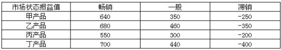 不定项选择题 国内某知名电视生产企业采用SWOT分析法,分析企业面临的内外部环境,并进行战略选择。该企业不断收购中小电视生产企业,扩大企业生产规模;加强内部成本控制,降低产品价格,成为行业中的成本领先者;同时,该企业针对儿童观看电视的需求,独家推出保护视力的防眩光、不闪式液晶电视,获得了市场的认可和顾客的青睐。该企业拟推出一款新型平板电视,共有甲产品、乙产品、丙产品和丁产品四种产品方案可供选择。每种产品方案均存在着畅销、一般、滞销三种市场状态,三种市场状态发生的概率无法预测。每种方案的市场状态及损益值如下表所示(单位:万元):