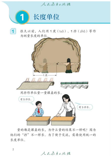 材料中有3个例题:①例1材料首先呈现古人用庹量巨石的宽度、用拃量布的长度以及用脚长量竹竿长度的情境,接着通过用拃量同样大小课桌的长,让学生了解由于各人手的大小不同(如师、生),“拃”的长度也因人而异。从而体会到统一长度单位的必要性,并使学生初步体会测量就是用“单位”量。