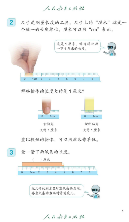 ②例2借助实际大小的厘米尺,让学生实际感知1厘米有多长,再通过比画、比较等操作活动加深学生对1厘米长度的认识。同时给出了表示厘米的符号“cm”,让学生了解。