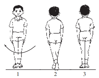 要求:根据老师口令进行练习:1.向后转体,2.并脚。