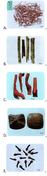 A 苏木 B 木通 C 通草 D 钩藤 E 降香