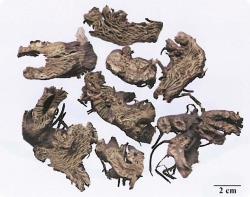 表面灰褐色,有断续的纵皱纹和支根痕,顶端有茎痕,周围有瘤状突起,体重,质坚实,味苦回甜的药材是