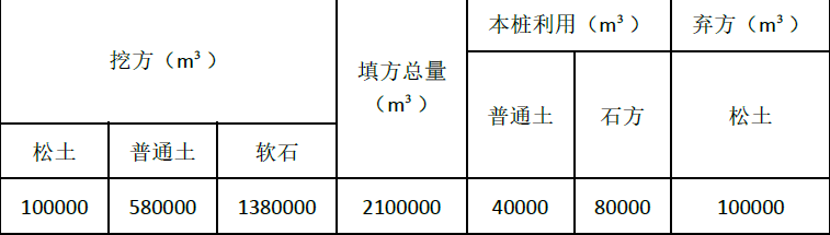 注:表中挖方、弃方为天然密实方,填方为压实方;除弃方外挖方全部利用,填方不足部分借普通土;路基加宽填筑需增加填方数量20000m。