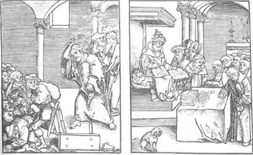 下图是1521年卢卡斯·克拉纳赫绘制的《从基督徒到反基督徒》漫画,学生解读漫画关键词是()。