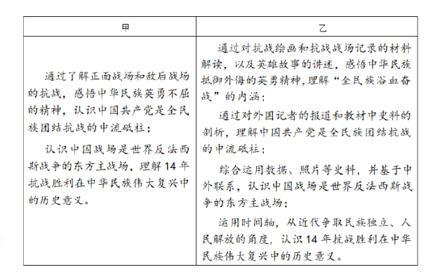 案例题 下面是两位实习生为《中外历史纲要(上)》第23课《全民族浴血奋战与抗日战争的胜利》拟定的教学目标,指导教师认为乙的设计更合理。
