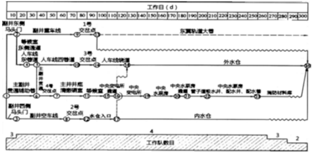 副井东侧马头门一等候室东侧通道一人车线东巷道至4号交岔点一人车线西巷道至3号交岔点一3号交岔点一人车线绕道一外水仓。工期:300d。