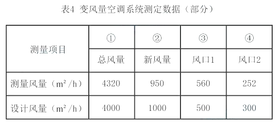 4、总风量与设计风量的允许偏差为-5%~10%,4000*(1+10%)=4400m3/h,测量总风量为4320m3/h符合要求;新风量与设计新风量的允许偏差为0~+10%,测量新风量为950m3/h,不符合要求;各风口风量与设计风量的允许偏差不应大于15%,风口1:500*(1+15%)=575m3/h,风口1测量风量为560m3/h,符合要求;风口2:300*(1-15%)=255m3/h,风口2测量风量为252m3/h,不符合要求。