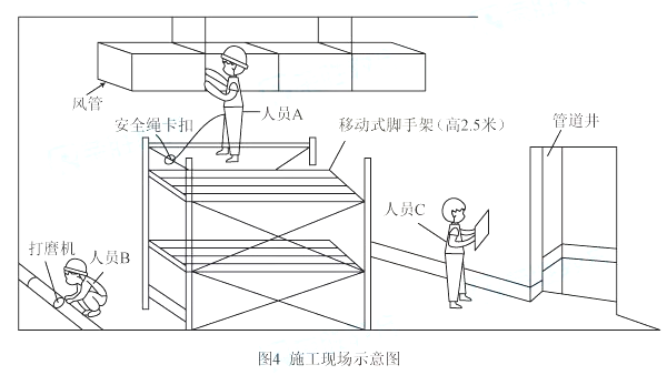 1、作业人员A安全绳低挂高用,安全带采用三点式;作业人员B未佩戴安全防护面罩,打磨机线路从脚下穿过存在触电和绊倒隐患;作业人员C未佩戴安全帽;管道井口未设置防护栏杆。