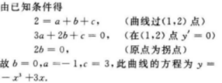 问答题 已知曲线y=ax3+bx2+cx在点(1,2)处有水平切线,且原点为该曲线的拐点,求a,b,c的值,并写出此曲线