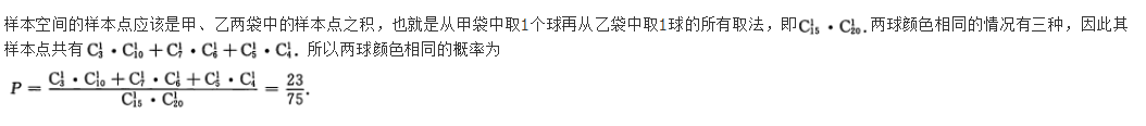 问答题 甲袋中有15只乒乓球,其中3只白球,7只红球,5只黄球,乙袋中有20只乒乓球,其10只白球,6只红球,4只黄球,