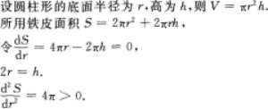 问答题 用铁皮做一个容积为V的圆柱形有盖桶,证明当圆柱的高等于底面直径时,所使用的铁皮面积最小.