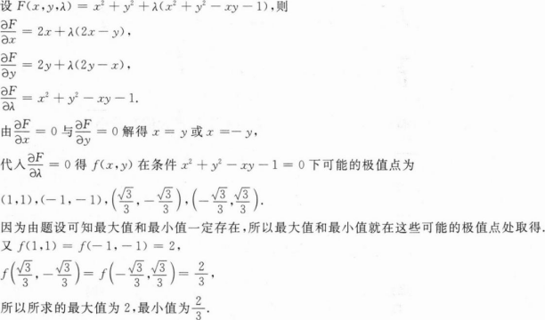解答题 求函数f(x,y)=x2+y2在条件x2+y2-xy-1=0下的最大值和最小值.