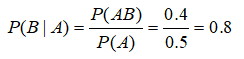 填空题 设A,B为两个随机事件,且P(A)=0.5,P(AB)=0.4,则P(B|A)=