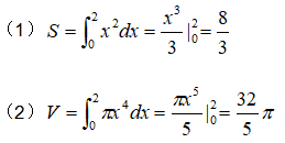 问答题 设D为由曲线y=x2,y=0,x=2所围成的图形. (1)求D的面积; (2)求D绕x轴旋转一周所得旋转体的体积