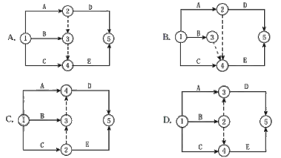 单选题 某工程有A、B、C、D、E五项工作,其逻辑关系为A、B、C完成后D开始,C完成后E才能开始。则据此绘制的双代号网络图是( )。