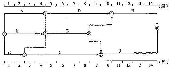 某工程项目双代号时标网络计划如下图所示,其中工作E的总时差和自由时差,分别为( )周。