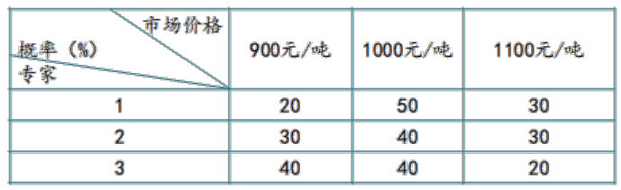 对某投资项目进行决策分析时,估计产品的市场价格为1000元/吨。为了分析产品价格变化的风险,请3位专家对其价格可能出现的状态及相应的概率进行了预测,如下表所示:
