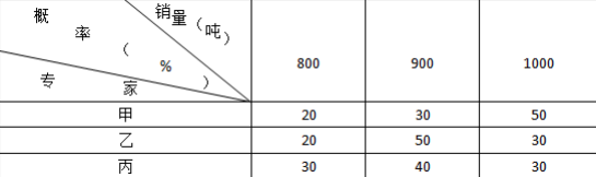 某项目决策分析时估计的项目产品市场销售量为每年900吨,为了分析销售量的风险情况,请3位专家对其销售量可能出现的状态及其分布进行预测,如下表所示,则专家估计的销售量的期望值是( )吨。
