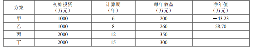 甲、乙、丙、丁四个方案为互斥方案,其现金流量如下表所示,折现率取12%。若方案分析采用净年值法,则较优的方案是( )。【