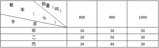 某项目决策分析时估计的项目产品市场销售量为每年900吨,为了分析销售量的风险情况,请3位专家对其销售量可能出现的状态及其分布进行预测,如下表所示:则专家估计的销售量的期望值是( )吨。