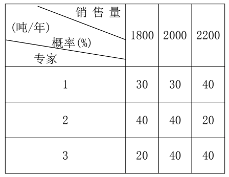 在进行某项目决策分析时,邀请 3 位专家对项目产品的年销售量及其可能的概率进行预测,预测结果如下表所示,则专家估计销售量