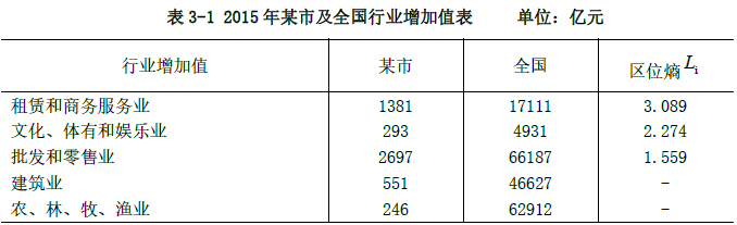 案例题 某市为我国珠三角地区的城市,近年来第三产业发展迅速,第三产业占地区生产总值比重超过 70%。为进一步促进产业发展,该市现委托某咨询企业为其编制产业规划。咨询企业从该市的统计年鉴中获取了以下行业增加值数据(表 3-1),想通过这些数据来分析哪些行业是具有全国比较优势的产业。