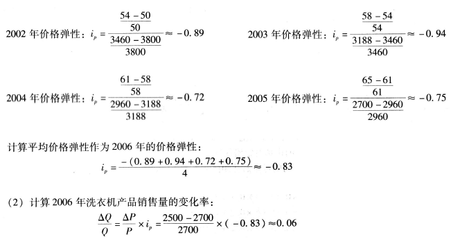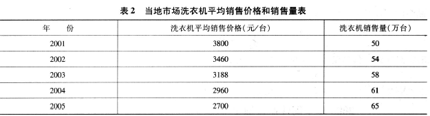 2.(1)题目中没有直接给出当地洗衣机的价格弹性系数,表 2给出了200l~2005年的销售价格和销售量,可以计算各年价格弹性系数得: