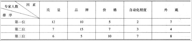 根据得分情况,5 个因素的重要性排序为:品牌、质量、价格、外观、自动化程度。