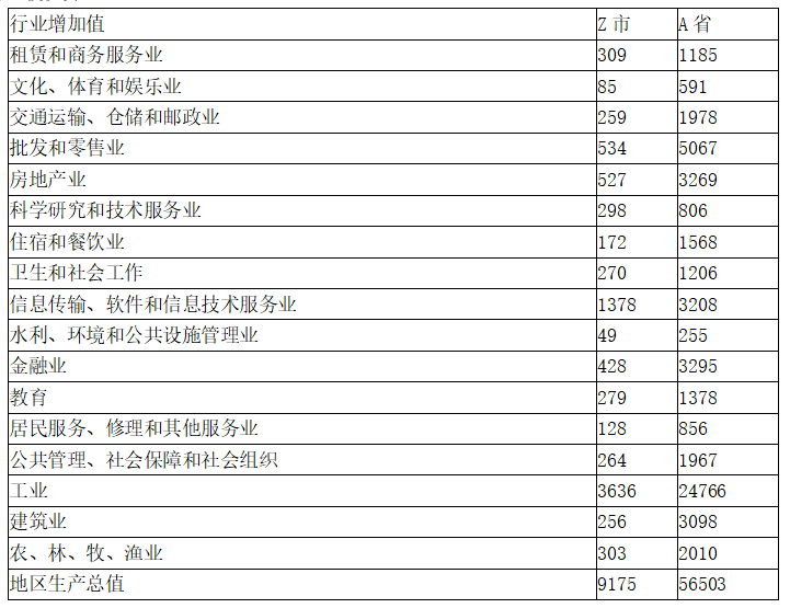 案例题 Z市近年来经济增长势头良好,发展速度较快。为进一步促进地区发展,Z市委托某咨询公司为其编制产业规划。在咨询过程中,该咨询公司获取了2019年Z市及A省以下行业增加值数据如下表所示。请问该咨询公司可以采用何种方法来分析该市的优势产业,并分析该市哪些产业在全省具有比较优势。