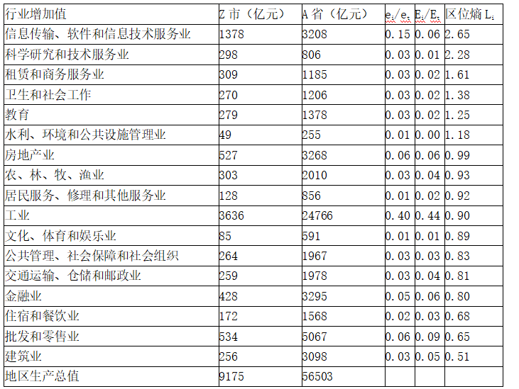 计算结果显示,Z市的信息传输、软件和信息技术服务业,科学研究和技术服务业,租赁和商务服务业,卫生和社会工作,教育,水利、环境和公共设施管理业的区位熵分别为2.65,2.28,1.61,1.38,1.25,1.18,区位熵大于1,可以认为这些行业在省内具有比较优势。通过结果看到,Z市的服务业,特别是信息产业和科研教育类的服务业在省内具有较强的竞争优势。