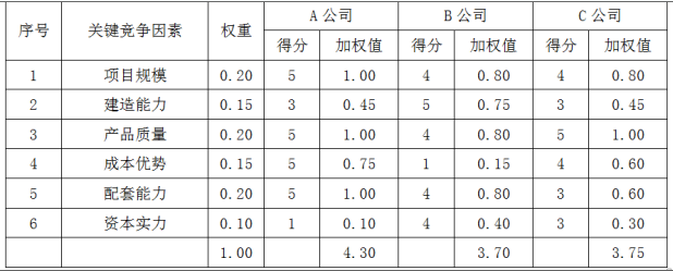 从计算结果来看,A公司的加权强势得分为4.3分,B公司的加权强势得分为3.7分,C公司的加权强势得分为3.75分,因此可以看出,A公司的竞争实力要明显强于B、C公司。