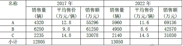1.2022年A、B、C三家企业的销售量和销售价格能客观反映三家企业各自的生产能力和价格优势。根据A、B、C三家企业区域市场销售数据可知,2022年A、B、C企业生产能力排序为A、B、C。价格优势排序为B、A、C。