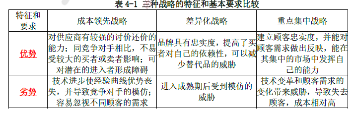 差异化战略的优势:品牌具有忠实度,提高了买者对自己的依赖性,可以减少替代品的威胁。劣势:进入成熟期后受到模仿的威胁。
