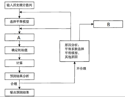 问答题 下图为指数平滑法工作流程图,请写出 A、B 过程的名称。