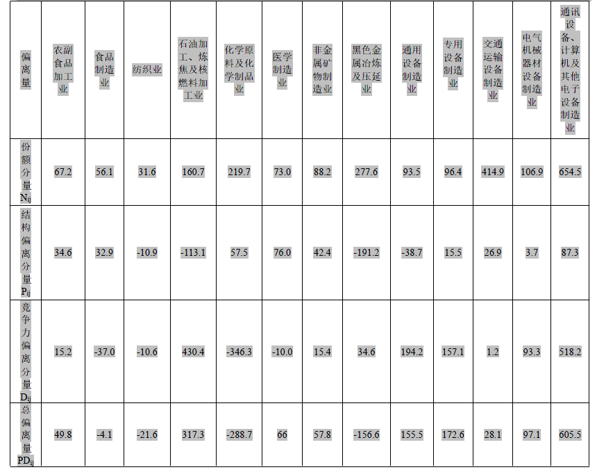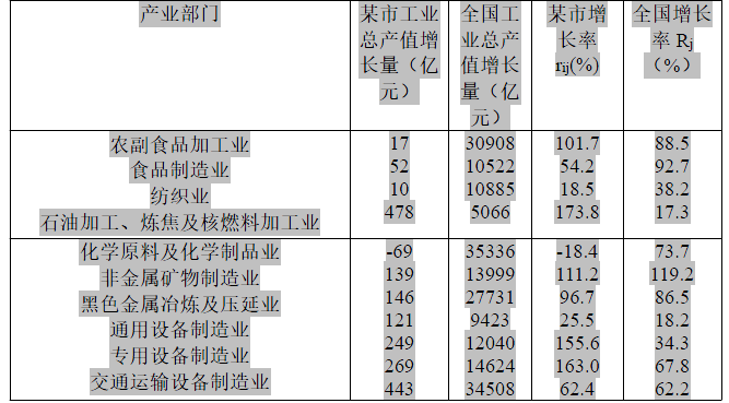 偏离‐份额分析法可以用来评价区域经济结构和竞争力,找出区域具有相对竞争优势的产业部门,确定区域未来产业结构调整的方向。该研究机构采用偏离‐份额分析法可以对某市主要制造业的竞争力情况进行分析。