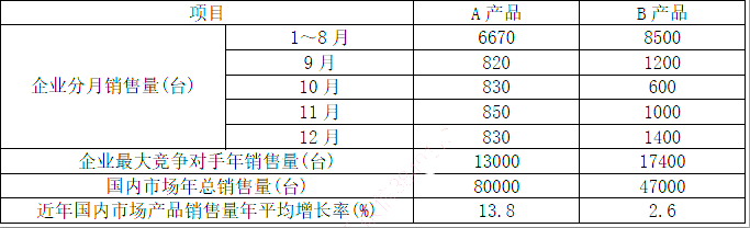 2.A产品更适合采用一次指数平滑法对市场销售量进行短期预测。理由说明:一次指数平滑法适用于市场观测呈水平波动、无明显上升或下降趋势情况下的预测。2023年9-12月份,A产品销售量数据呈水平波动,B产品销售量数据波动较大,有明显的上升和下降趋势。