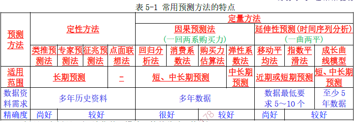 在实践中,多采用定性预测与定量预测相结合的方法。常用预测方法的特点见表5-1。