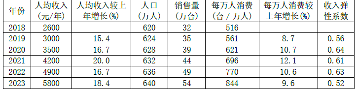 以2023年为基数则:2025年每万人该家用电器消费增长率=收入增长比率×收入弹性系数=36%×0.59=21.2%。