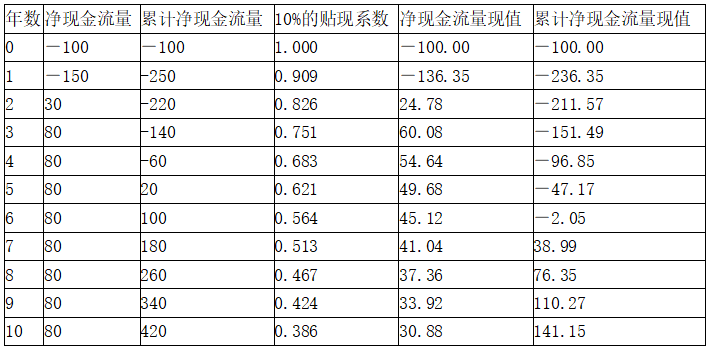 问答题 某工程项目的现金流量如下表所示。 试计算:动态投资回收期(ic=10%)。 注:标准年数列0表示建设起点(第1年