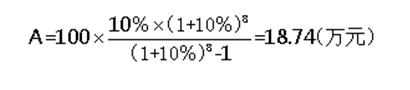 案例题 某企业从银行贷款100万元投资于某项目,若偿还期为8年,每年末偿还相等的金额,贷款年利率为10%。试求每年末应偿还(包括本和息)多少?