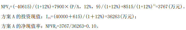 方案 A 第 11 年末净现金流量=12000-4100+615=8515(万元);注:不考虑期末残值,考虑回收流动资金。