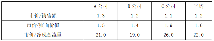 问答题 欲评估甲公司的价值,从市场上选取了三个相似的公司A、B、C。分别计算各公司的市场价值与销售额的比率、与账面价值的比率以及与净现金流量的比率为可比价值倍数,得到结果如下表所示。