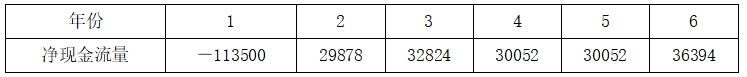 =-113500/(1+10%)+29878/(1+10%)2+32824/(1+10%)3+30052/(1+10%)4+30052/(1+10%)5+36394/(1+10%)6