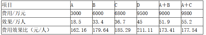 2)A+C:费用为(3000+6800)万元=9800万元,效果:(18.5+36.7)万人=55.2万人,费用效果比=9800万元/55.2万人=177.54元/人;