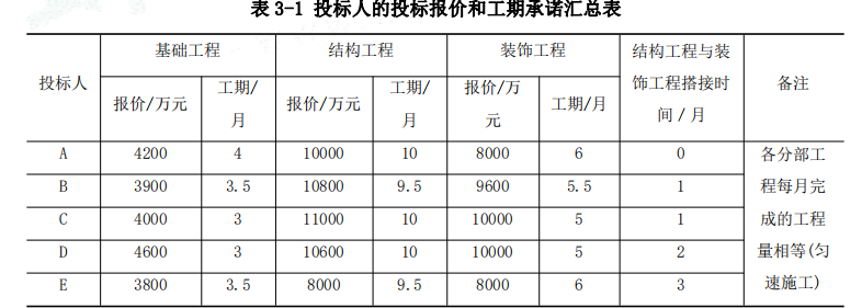 4.A 投标人:自报工期=(4+10+6)月=20 月; 经评审的投标价=报价=(4200+10000+8000)=22200 万元。因自报工期超过招标文件要求的 工期,该投标文件没有对招标文件的实质性要求和条件做出响应,评标委员会应当否决其投标。 B 投标人:自报工期=(3.5+9.5+5.5-1)月=17.5 月; 经评审的投标价=报价=(3900+10800+9600)=24300 万元。 C 投标人:自报工期=(3+10+5-1)月=17 月; 经评审的投标价=报价=(4000+11000+10000)=25000 万元。 D 投标人:自报工期=(3+10+5-2)月=16 月; 经评审的投标价=报价=(4600+10600+10000)=25200 万元。 E 投标人:自报工期=(3.5+9.5+6-3)月=16 月;