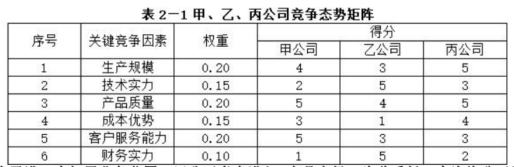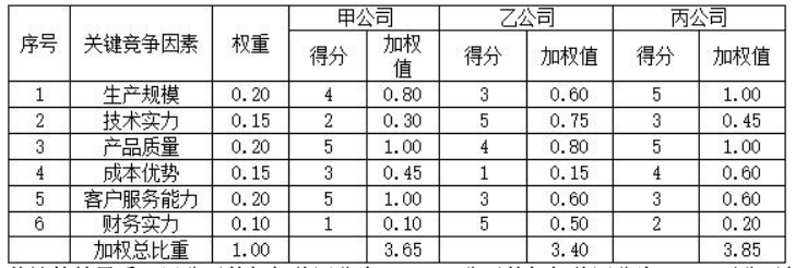从计算结果看,甲公司的加权总评分为3.65,乙公司的加权总评分为3.40,丙公司的加权总评分为3.85。因此,甲公司的综合竞争能力比乙公司强,比丙公司弱。